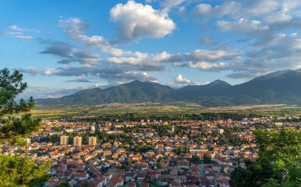 Панорамен изглед към Разлог с величествения Пирин на хоризонта